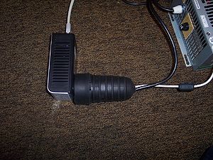 Near the router, the other homeplug is connected to the phoneline in the same way, using a piece of phone wire with a ferrite bead and T-connectors.
