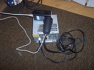 The homeplug adapters can be powered with 100 to 240 volts AC, I wasn't about to connect the mains wiring to the phone cable, but luckily I had a 30 VA 230 to 115 volts transformer to power the homeplugs, and a housing of computer power supply to put the transformer in. The power supply's connector has a netfilter built in, which helps to block high frequency interference from the mains, although I doubt that those frequencies are passed by the transformer. The transformer is protected by a 160 mA fuse in series with the primary winding (white fuseholder with red wires), and the phoneline and homeplugs are protected by a 125 mA fuse in series with the secondary winding of the transformer (black panel mount fuseholder on the right).
