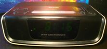 Een klassieke wekkerradio van Philips met klok op netstroom frequentie en 9v back-upbatterij. Een oude versie van dit model met groen display, ingebouwde travo en analoge afstemschaal. In tegenstelling tot de nieuwere versies met fel rode cijfers, externe voeding en SMD componenten zit de behuizing hier vol en laat weinig ruimte over voor projecten. De radio verkeert in zeer slechte staat. De AM band is stokdoof en zodra een FM station is gevonden slaat de radio af. Een keramische condensator flappert in de wind en twee elco's zijn overleden aan zware diaree. De PCB ziet eruit alsof een kind er met kleurpotloden overheen is gegaan en de antennedraad is naar de kapper geweest. De behuizing is vermoedelijk door zon en warmte van de travo vergeeld en aan de onderkant zelfs broos. Zoals het bij een afgedankte radio hoort mist het klepje voor batterij, zit er latex verf op de stekker en mist een van de pootjes het rubber. De kleur groen van het display is erg chique en voor het bouwjaar zit er een relatief mooi lopende varicap in.
