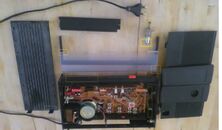 Eerst maar eens grotendeels uit elkaar gehaald. Zwarte panelen in de vaatwasser en blinken weer. Het frontpaneel had een afgebroken klemmetje dat los in de radio lag. Vastgeplakt met secondenlijm en een dupont stekkertje als versteviging. Na het afkrabben van de verfspatten ziet dat er weer redelijk uit. Het acrylscherm de hele lijn van 400/600/1200/1500/2000/commandant 4/brasso laten doorlopen. Alle krassen zijn er uit, maar de wolken zitten tot heel diep. Die UV schade komt denk ik nooit meer helemaal goed, het plastic is ook erg broos. Wel is de FM afstemschaal aan de bovenkant nu weer te lezen. De binnenkant is met wat perslucht en een kwast ook weer toonbaar. De volumeknop werkt weer kraakvrij na een flinke massage met contact spray en afstemmen gaat ook weer zonder gepiep na een drupje olie op de draad.